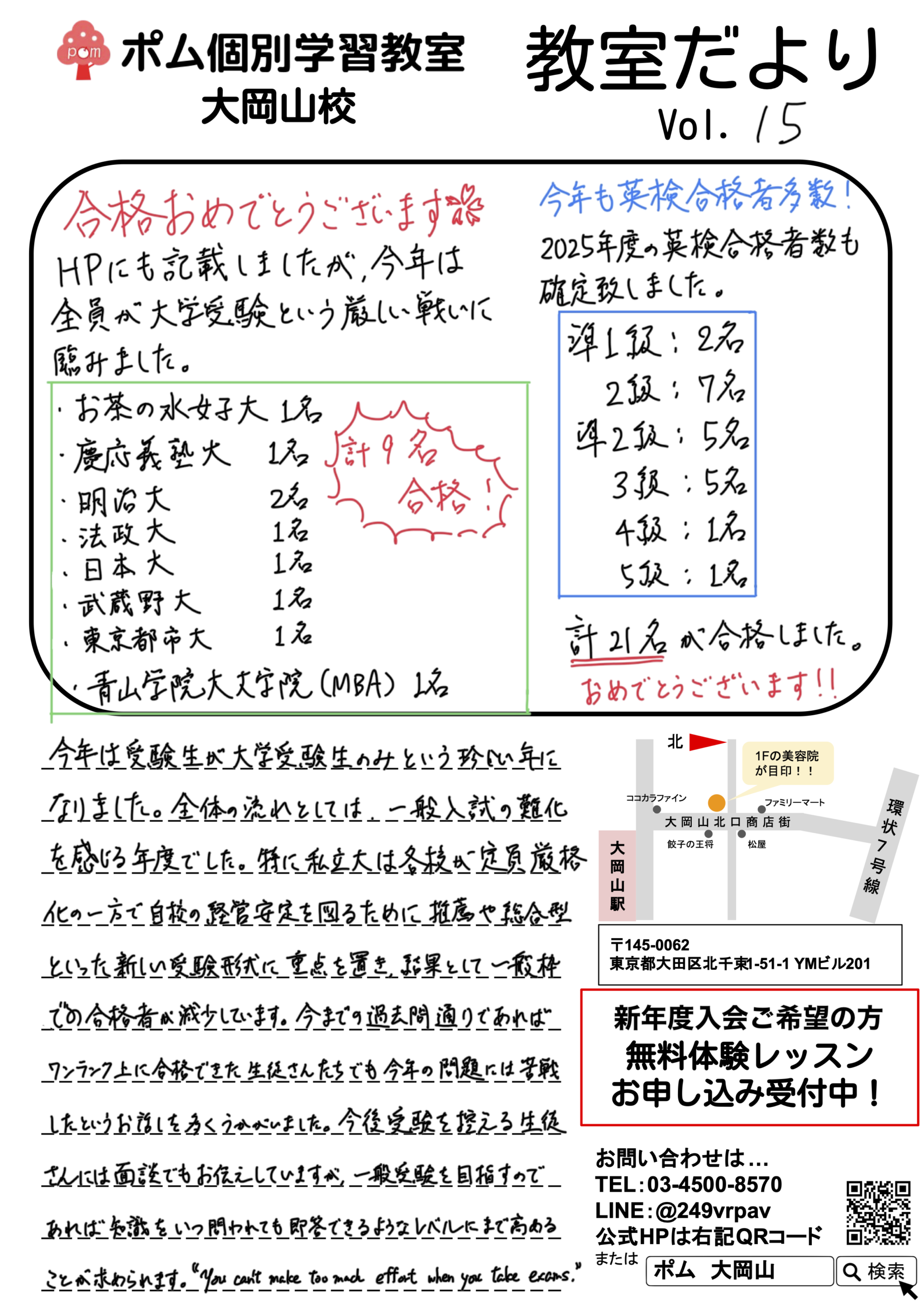 新年度入会ご希望者の体験授業を実施しております。(昨年度の卒業生が多かったため、2026年3月現在、木曜日以外に空きがございます。)